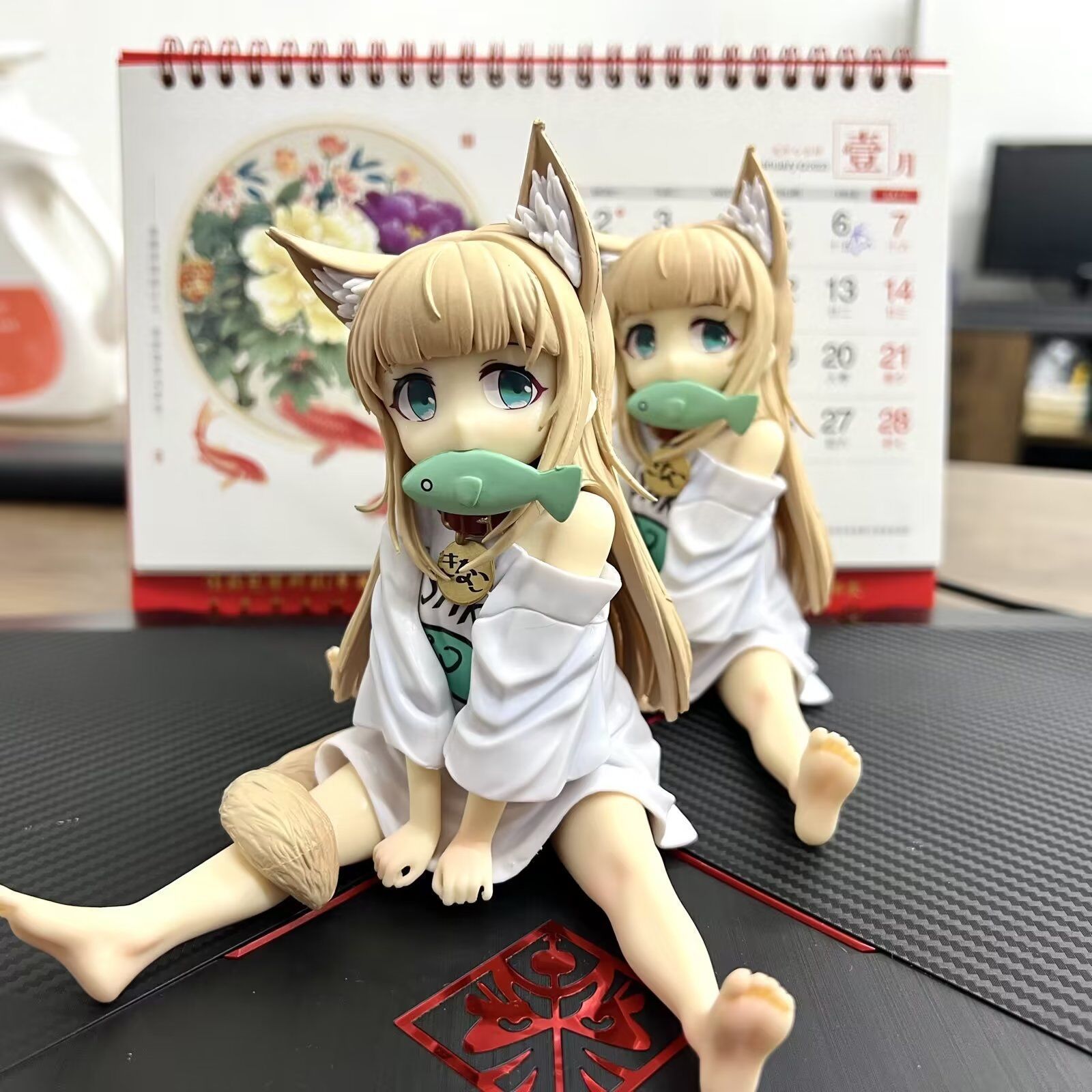 – một nhân vật thường thấy trong văn hóa anime và figure, mang phong cách dễ thương với tai cáo, mắt to màu xanh lá và biểu cảm ngây thơ. Dù thiết kế này không thuộc một anime cụ thể nổi tiếng, nhưng kiểu tạo hình rất phổ biến trong các bộ sưu tập figure gacha hoặc fanart. Cô mặc áo phông oversized, có đuôi cáo, đeo vòng cổ đỏ và đang giữ một chiếc mặt nạ/trang trí hình mặt em bé – làm tăng thêm nét dễ thương pha chút nghịch ngợm.